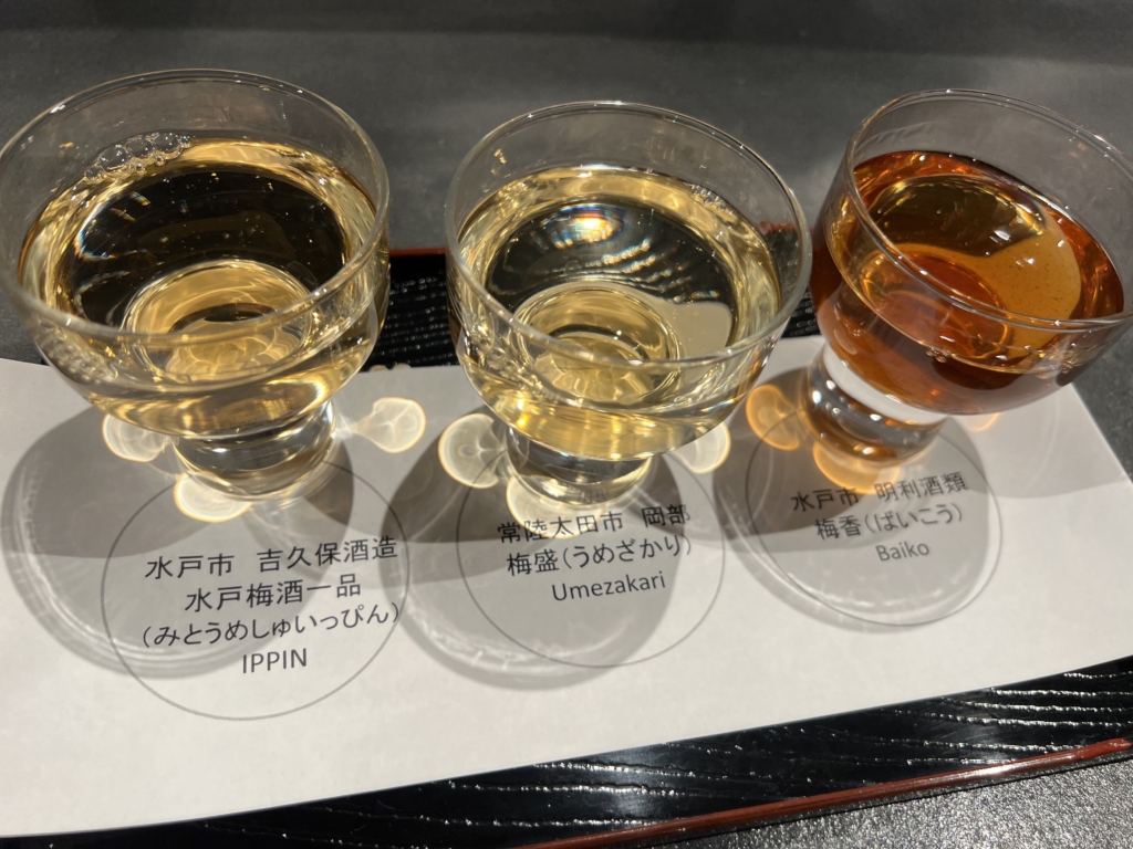 それに茨城は梅酒が有名だそうです。梅酒の3種の飲み比べセットを頼んで飲み比べを行いました。