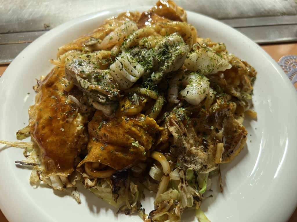 3日目の夕食は、広島駅のマルビアンというお店で広島風お好み焼きを食べました。