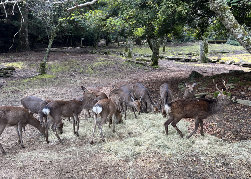 少し外れの方にある大元公園(おおもとこうえん)まで行くと、野生の鹿がたくさんいました。